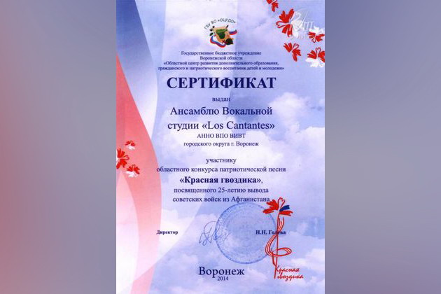 16 апреля 2014 года прошел финальный этап областного конкурса патриотической песни «Красная гвоздика», посвященный 25-летию вывода советских войск из Афганистана. Ансамбль вокальной студии "Los Cantantes" Воронежского института высоких технологий занял 2 место в номинации "вокальные ансамбли 16-25 лет".