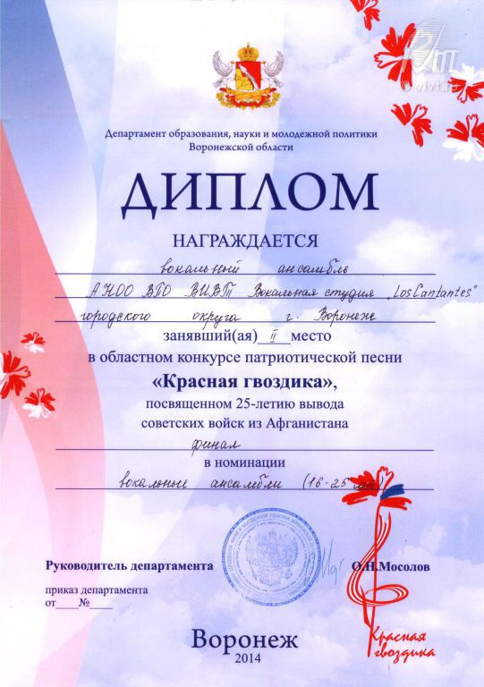 занявшую 2 место в финале областного конкурса патриотической песни "Красная гвоздика".